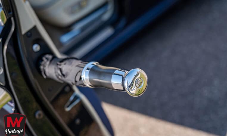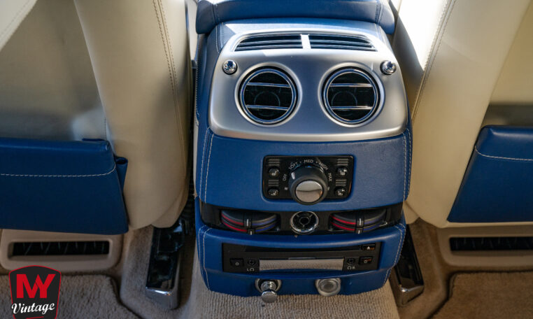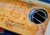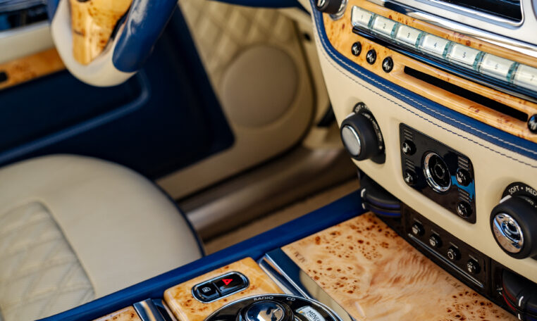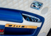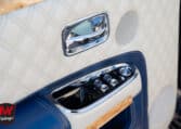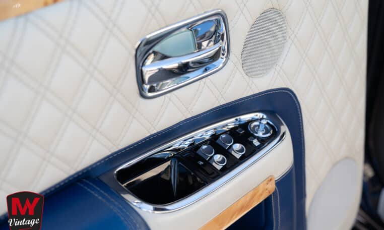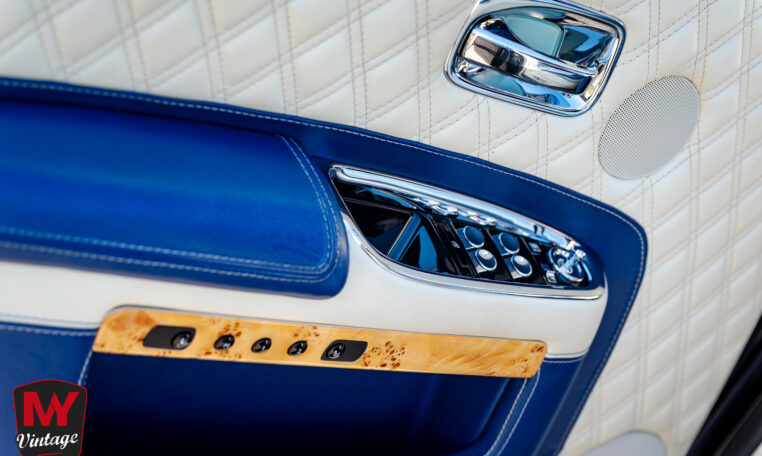 Intérieur exclusif : Un habitacle intégralement revêtu de cuir matelassé à carreaux dans une harmonie de bleu et de beige. Les finitions intègrent des boiseries rares en bambou.
